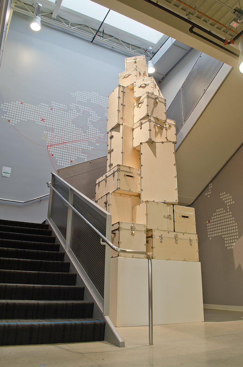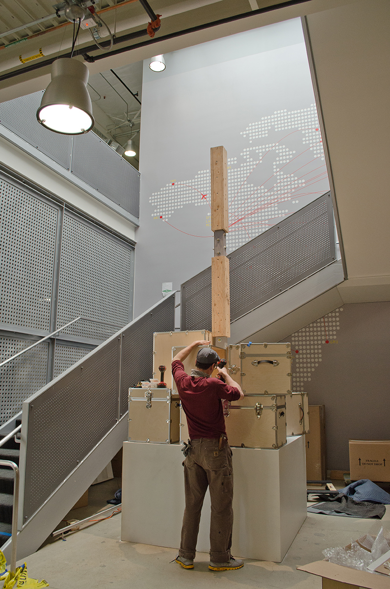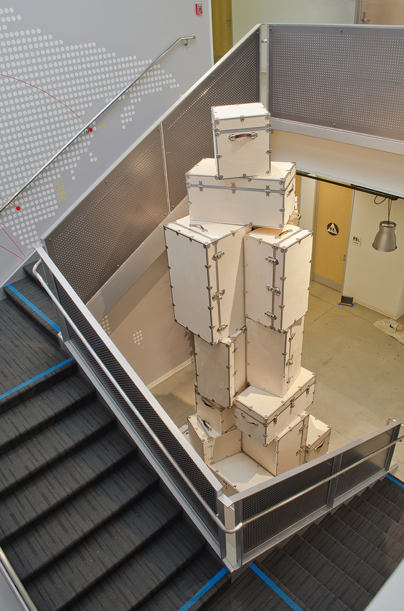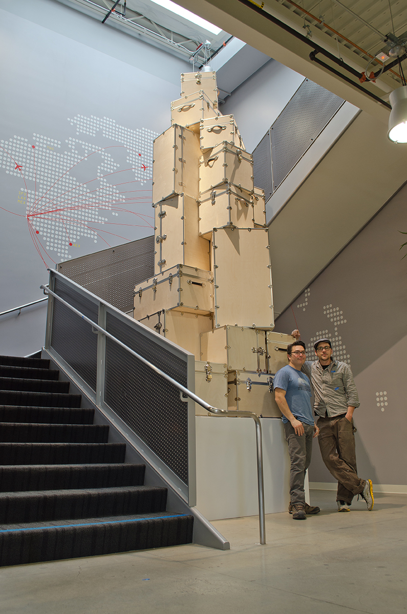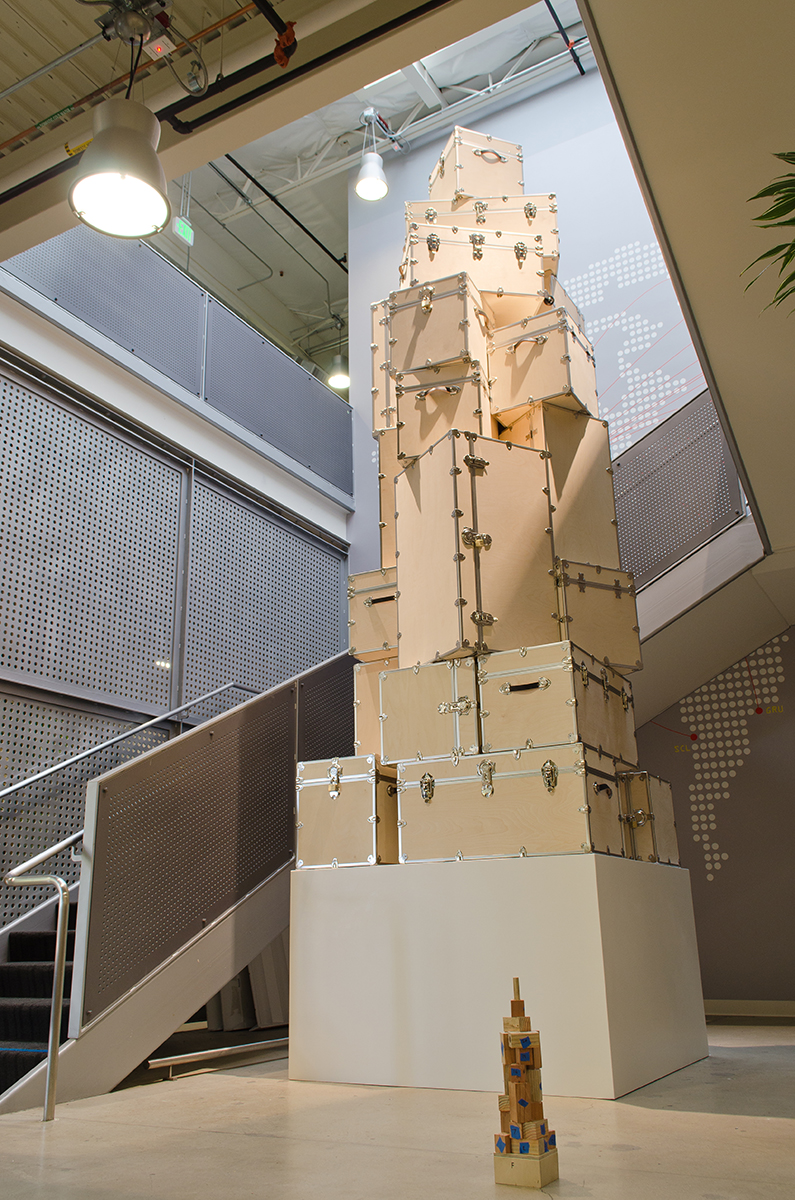 This sculpture is located at a tech firm in Mountain View. A 16’ sculpture of unfinished wood trunks evoking a sense of vintage travel with a crisp modern twist. This whimsical sculpture is composed of a stack of unfinished wooden trunks on a 5’ x 5’ x 3’ high pedestal with an internal steel support built from 4” x 4” 1/4” steel square tubing. Approximately 23 trunks of various dimensions are stacked creating a mighty tower of travel.