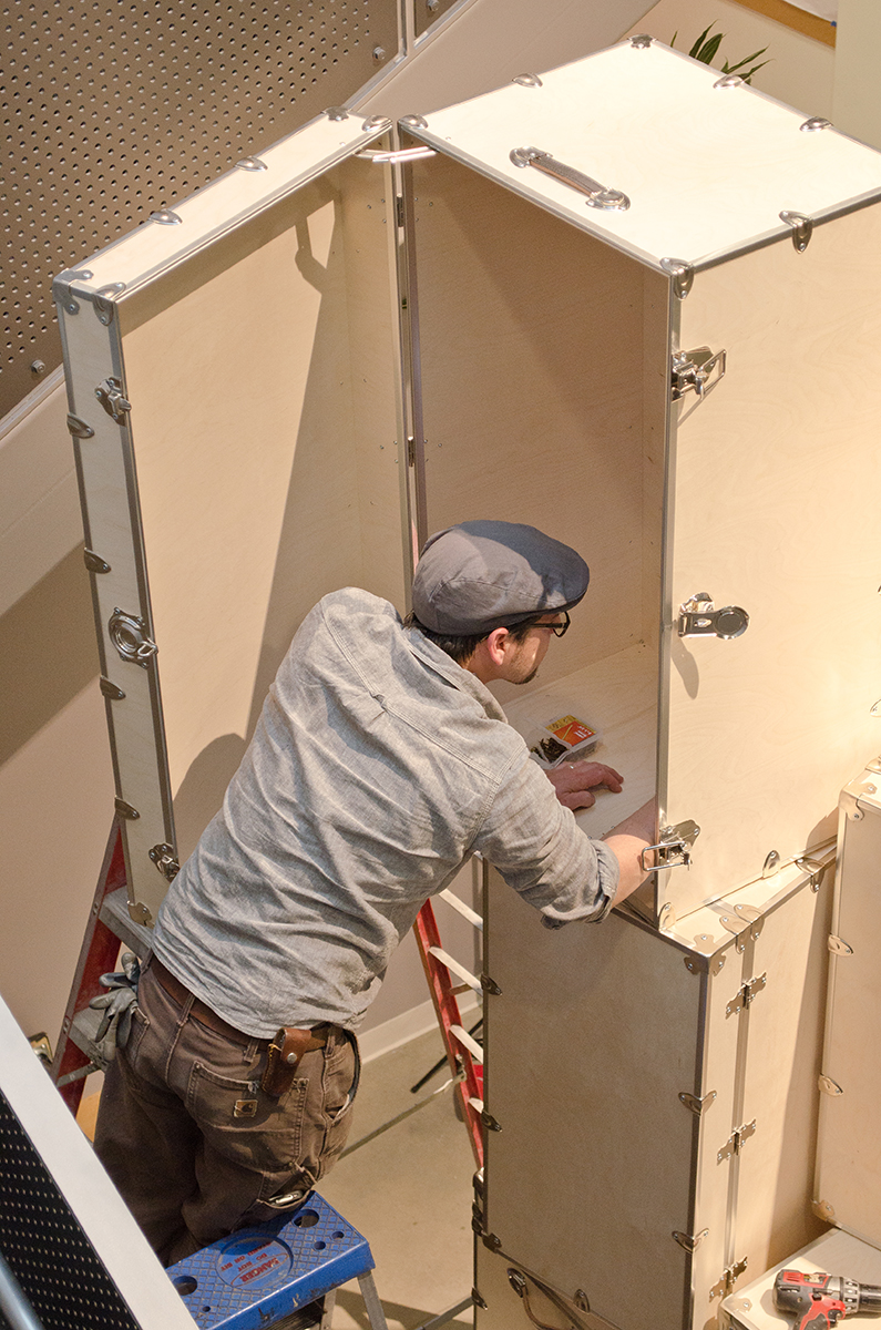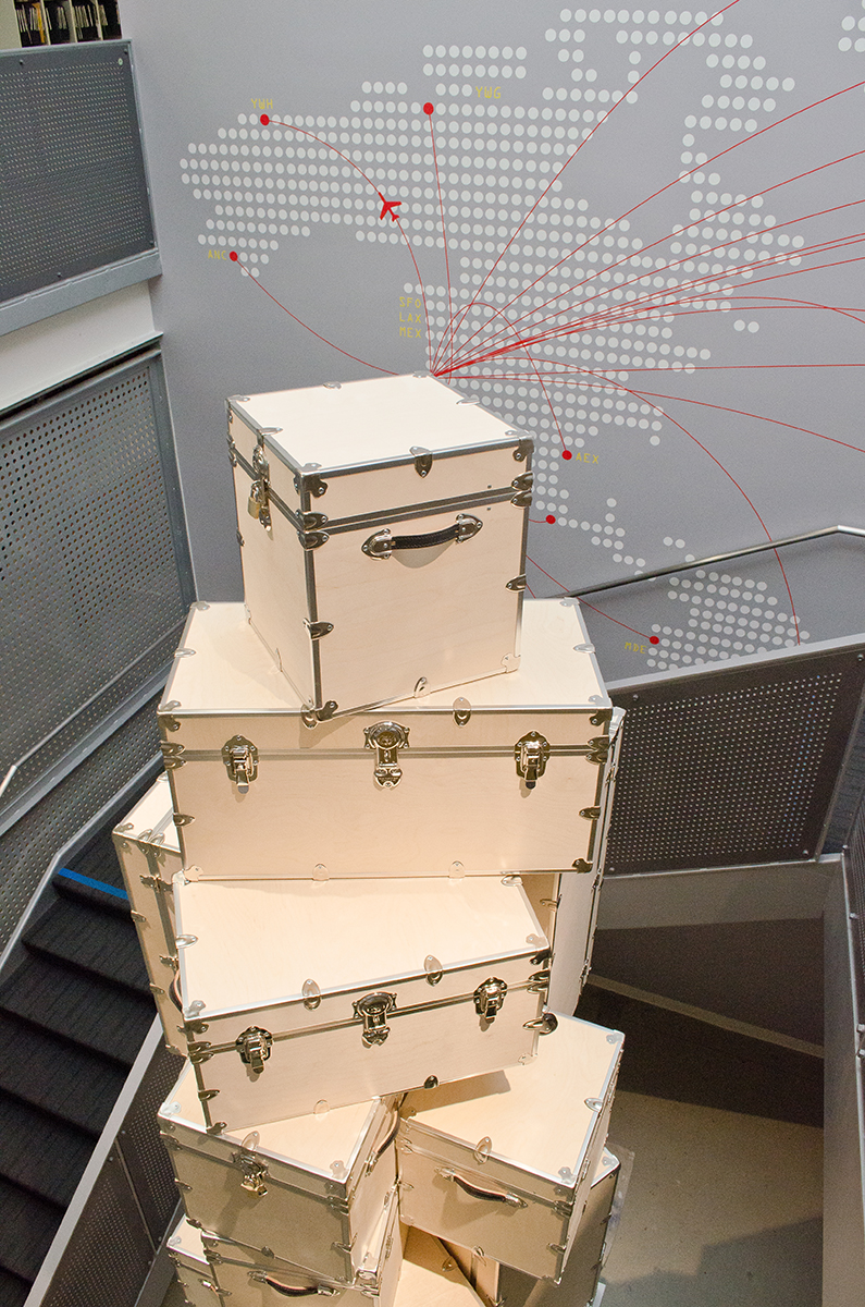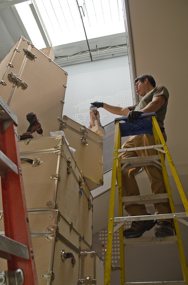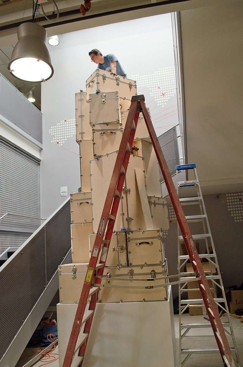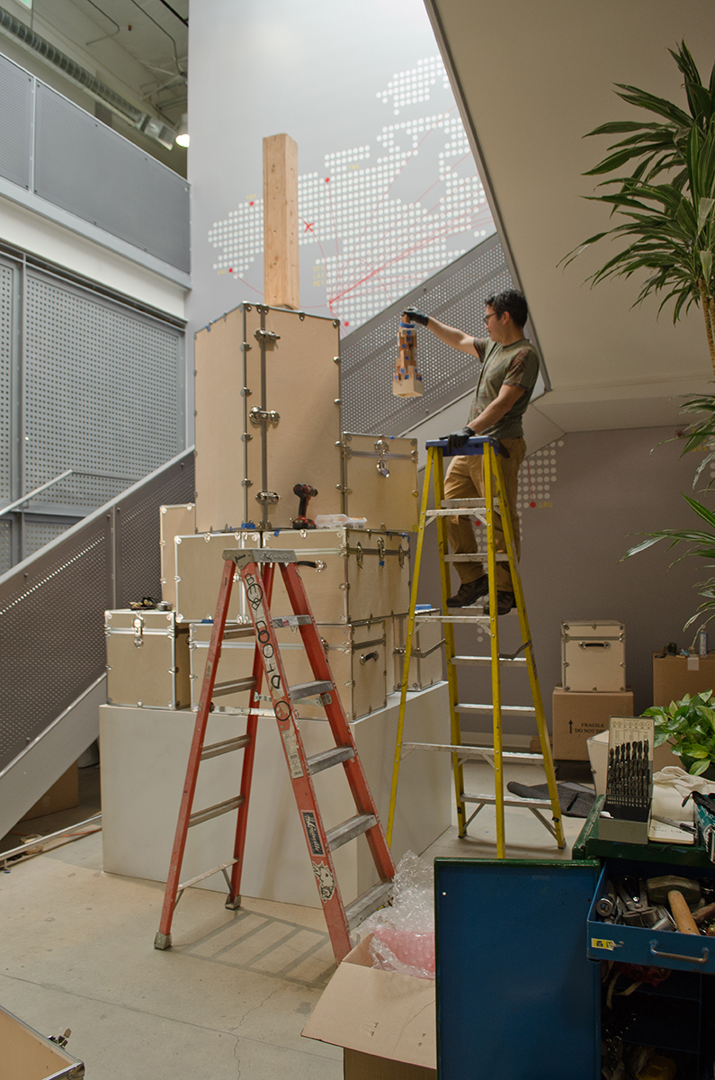 This sculpture is located at a tech firm in Mountain View. A 16’ sculpture of unfinished wood trunks evoking a sense of vintage travel with a crisp modern twist. This whimsical sculpture is composed of a stack of unfinished wooden trunks on a 5’ x 5’ x 3’ high pedestal with an internal steel support built from 4” x 4” 1/4” steel square tubing. Approximately 23 trunks of various dimensions are stacked creating a mighty tower of travel.