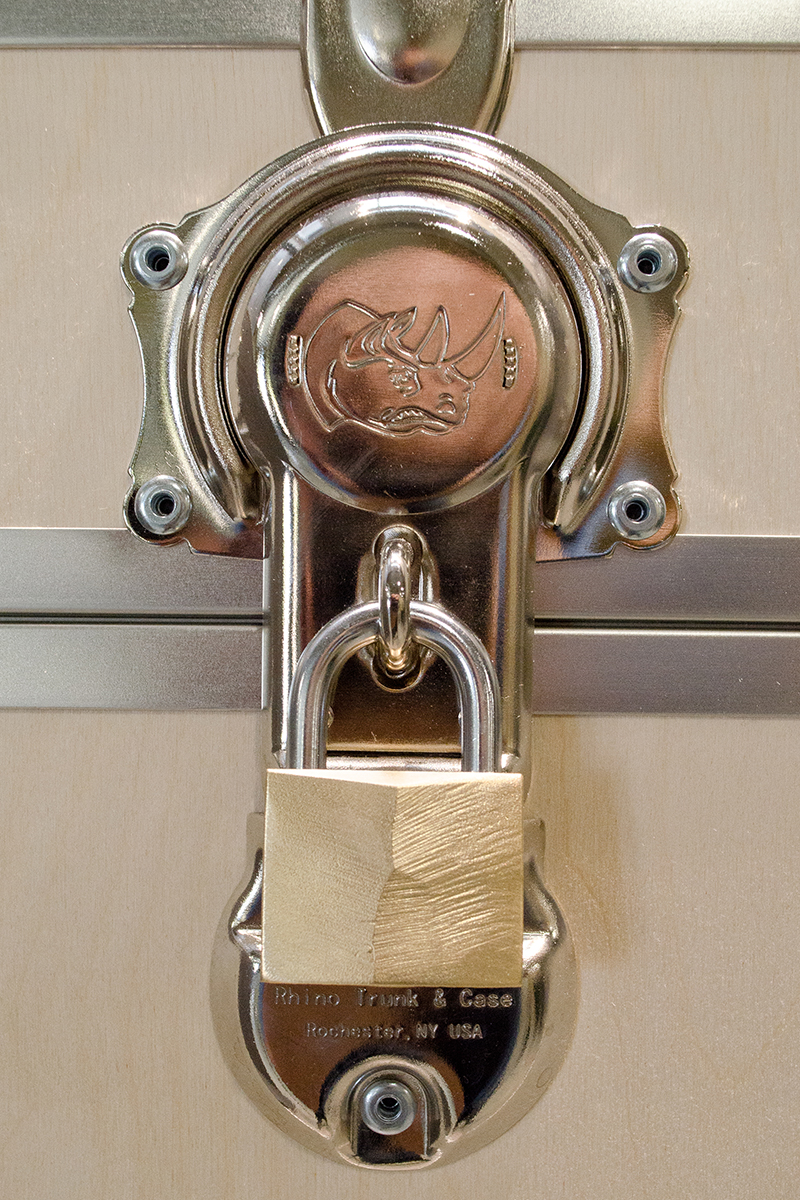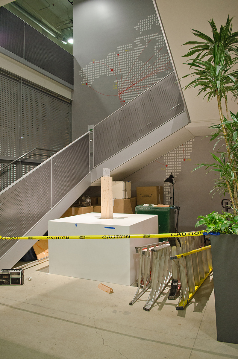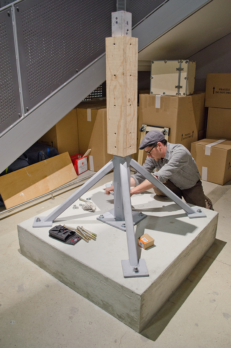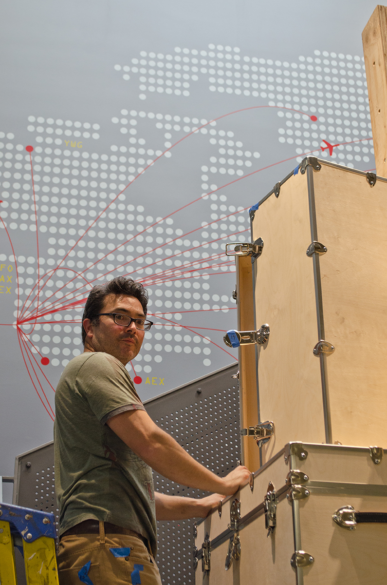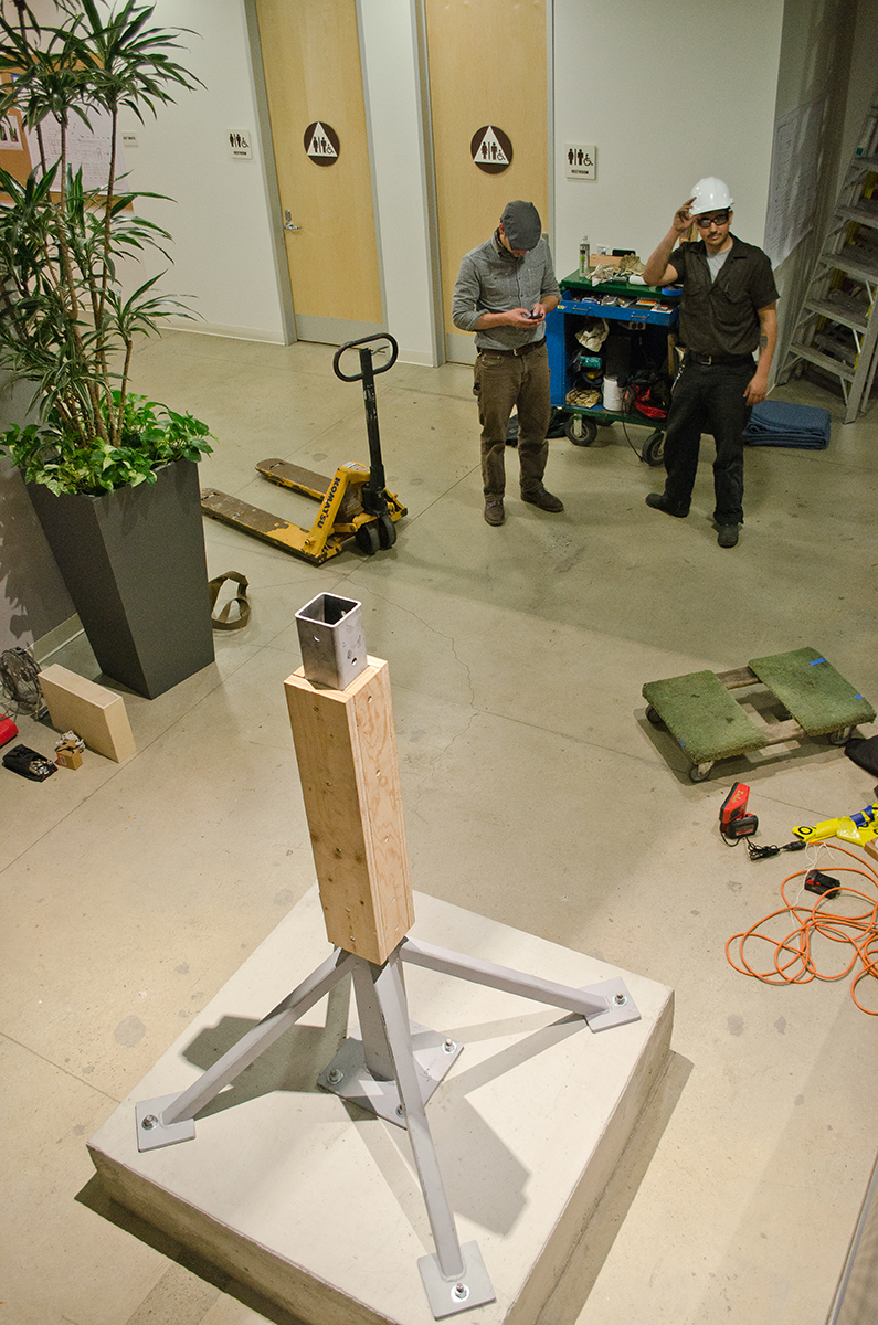 This sculpture is located at a tech firm in Mountain View. A 16’ sculpture of unfinished wood trunks evoking a sense of vintage travel with a crisp modern twist. This whimsical sculpture is composed of a stack of unfinished wooden trunks on a 5’ x 5’ x 3’ high pedestal with an internal steel support built from 4” x 4” 1/4” steel square tubing. Approximately 23 trunks of various dimensions are stacked creating a mighty tower of travel.
