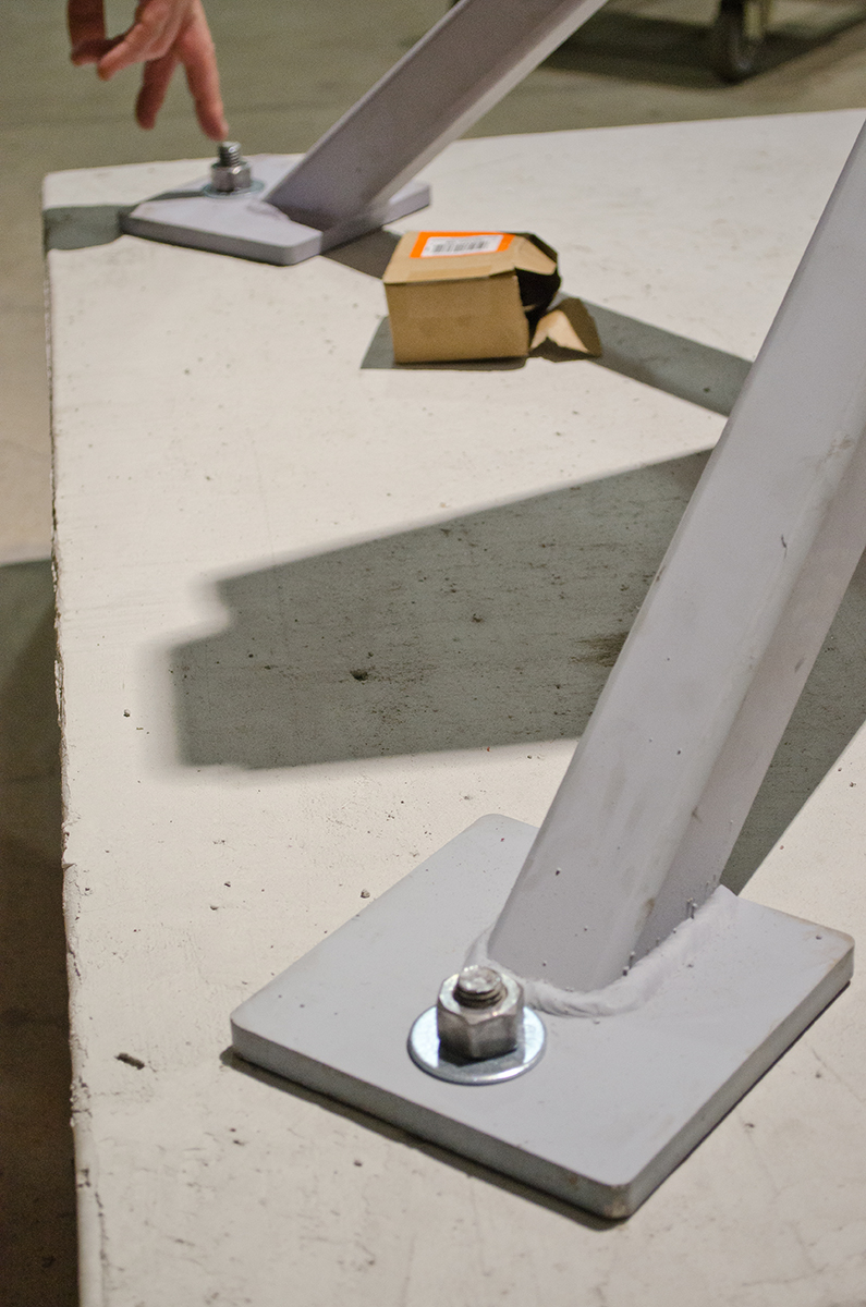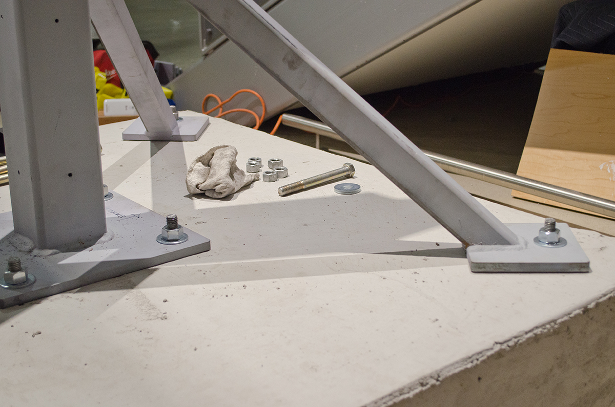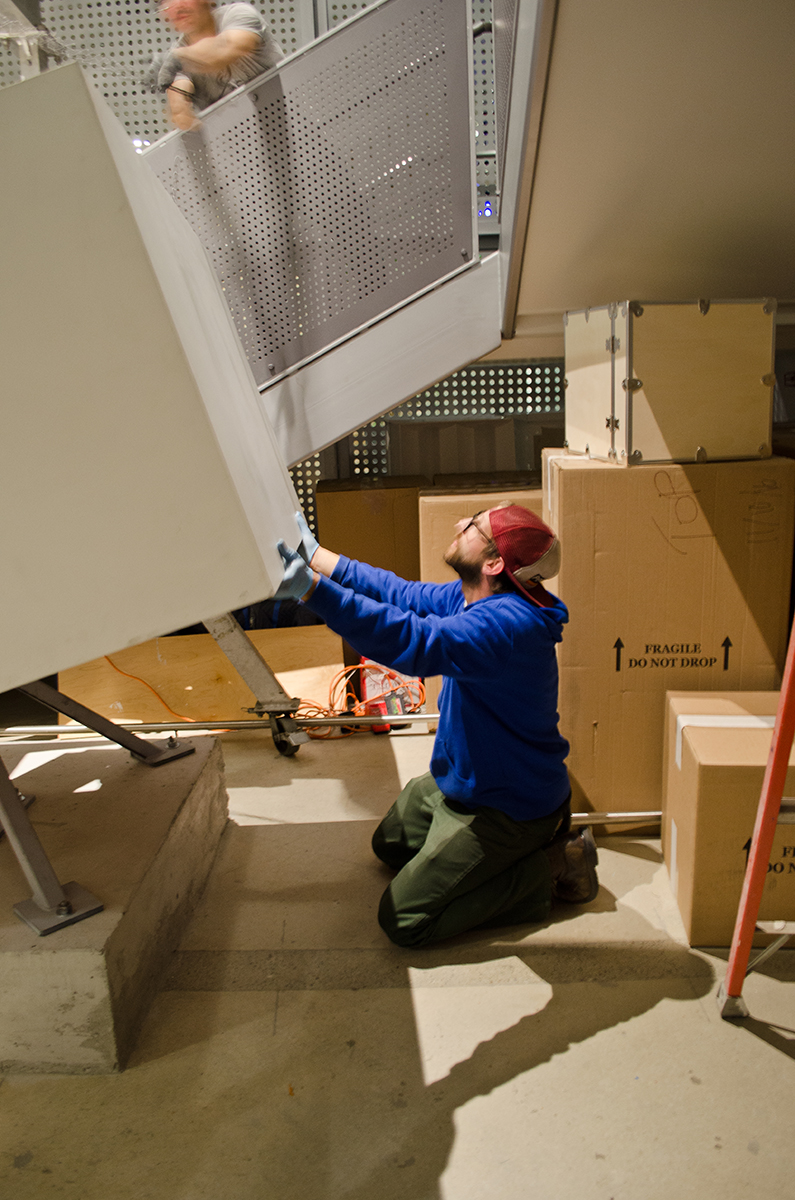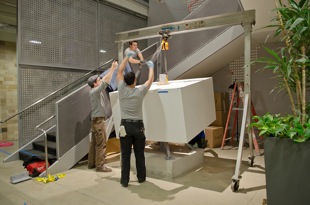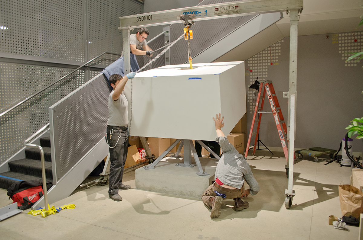 This sculpture is located at a tech firm in Mountain View. A 16’ sculpture of unfinished wood trunks evoking a sense of vintage travel with a crisp modern twist. This whimsical sculpture is composed of a stack of unfinished wooden trunks on a 5’ x 5’ x 3’ high pedestal with an internal steel support built from 4” x 4” 1/4” steel square tubing. Approximately 23 trunks of various dimensions are stacked creating a mighty tower of travel.