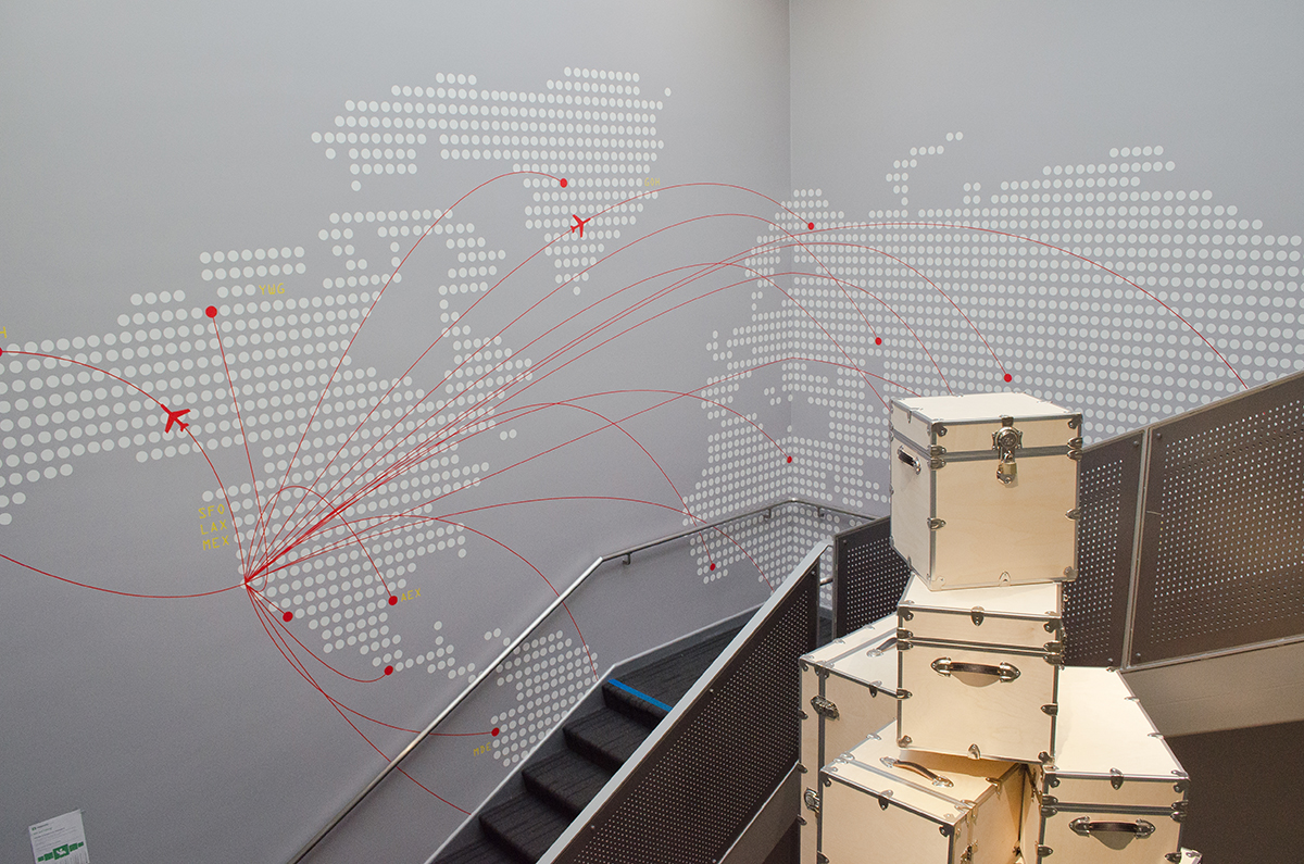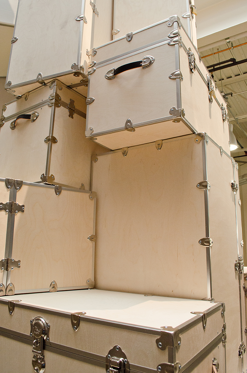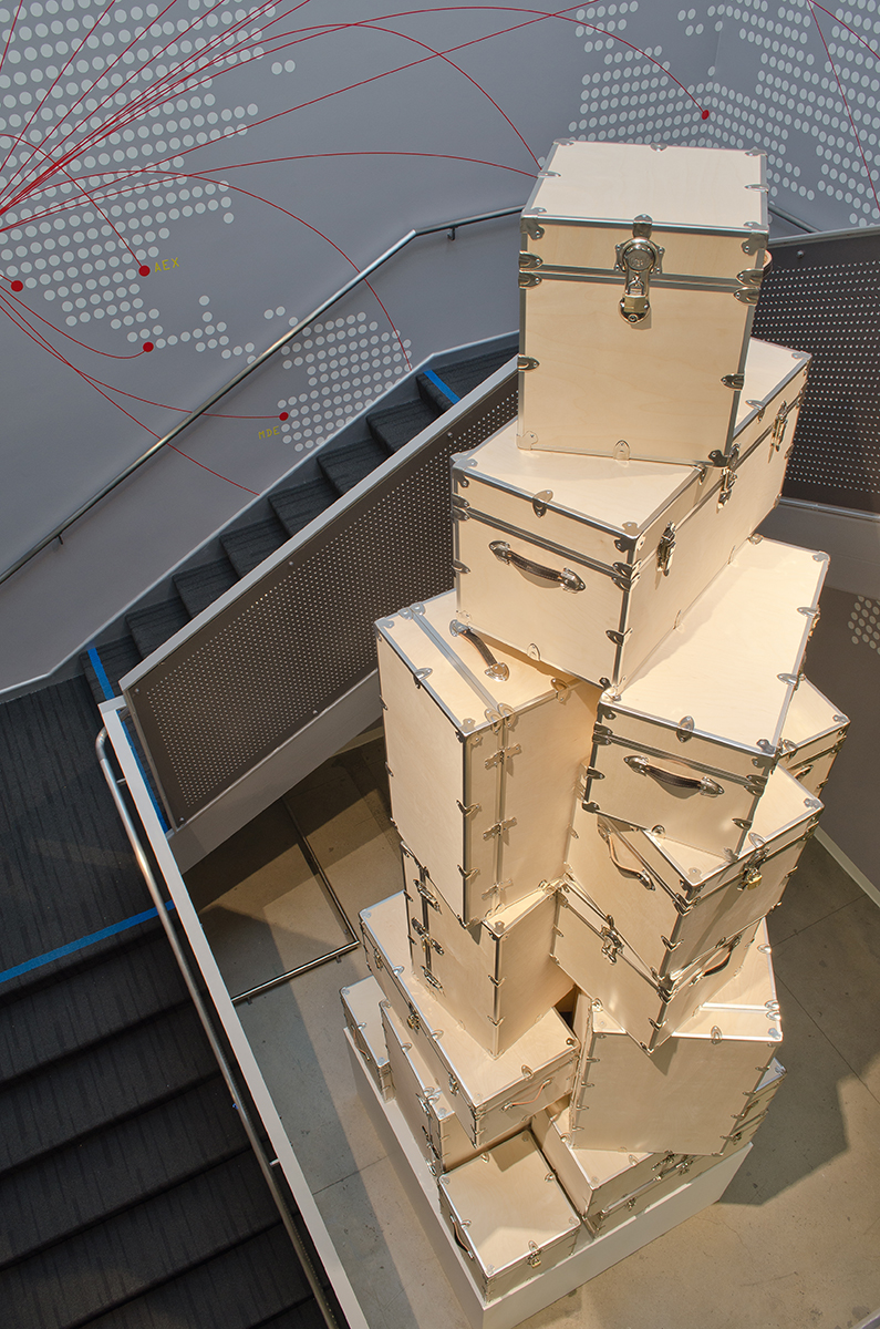 A 23’ sculpture of unfinished wood trunks evoking a sense of vintage travel with a crisp modern twist. This whimsical 16’ sculpture is composed of a stack of unfinished wooden trunks on a 3’ high pedestal. Approximately 20 trunks of various dimensions will be stacked creating a mighty tower of travel. The structure will be supported by an unseen central steel column with a steel plate base which will be anchored to the concrete floor. Additional anchoring will be done with one or more steel braces to the second story mezzanine. Trunks will be secured to one another in addition to the central post.