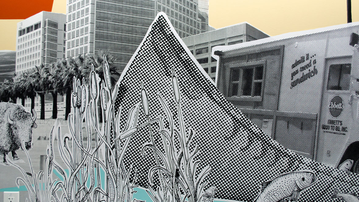 The South Bay mural is located in the cafe in tech firm office in Milpitas. This mural was designed digitally and was translated to a combination of graphic color fields, half-toned photographs of landscapes/food trucks, and illustrations of native California species. From left to right the landscape transforms to a collage of the city of San Jose to the rolling hills of East Bay and Mt. Tamalpais. A whimsical display of food trucks travel via Tom Sawyer raft to feed the awaiting businessmen and animals.